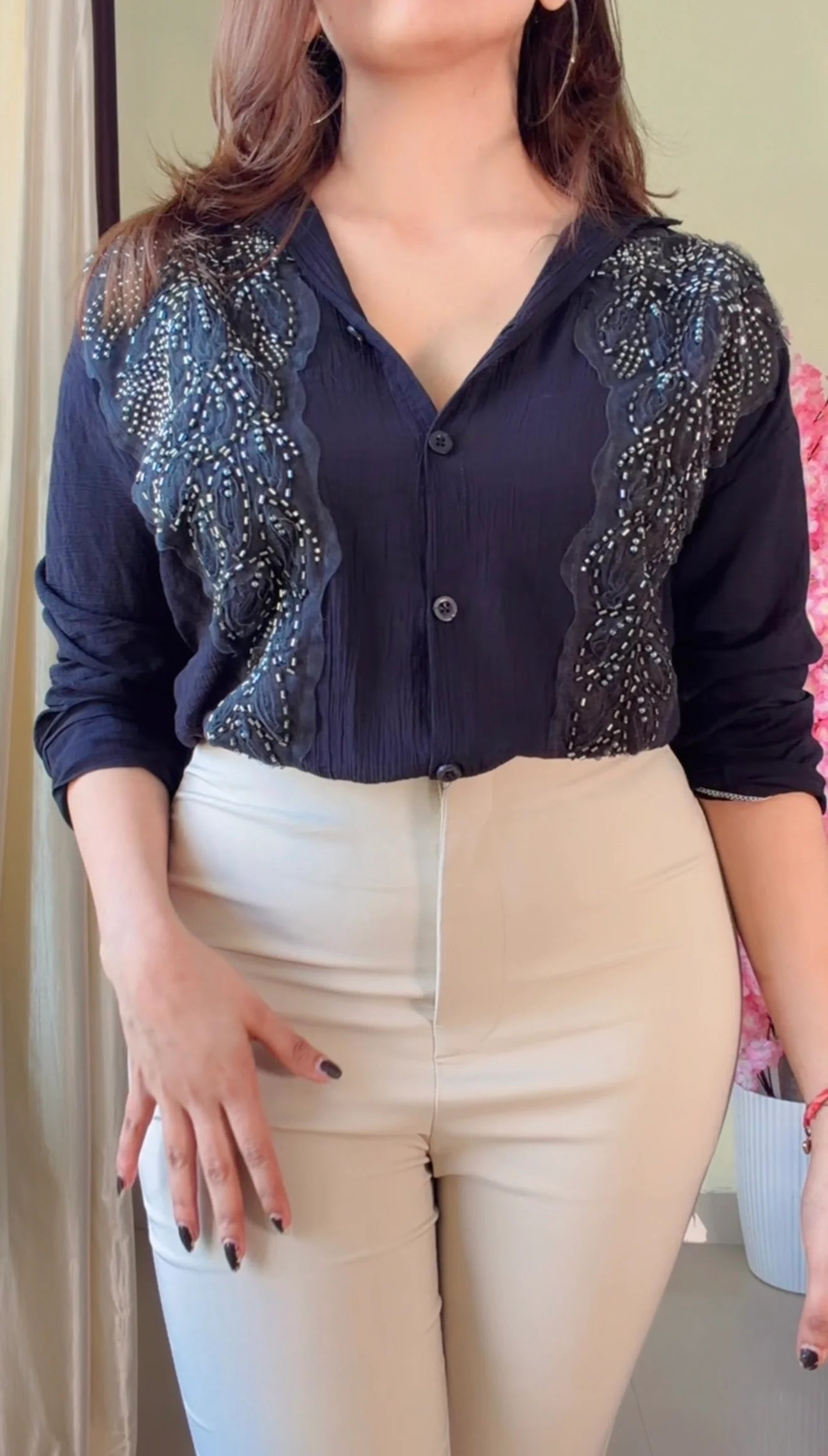 Crafted in soft crinkled cotton, this Black Shirt features elegant white leaf embroidery, a classic collar, and a button-down front—perfect for chic everyday wear.