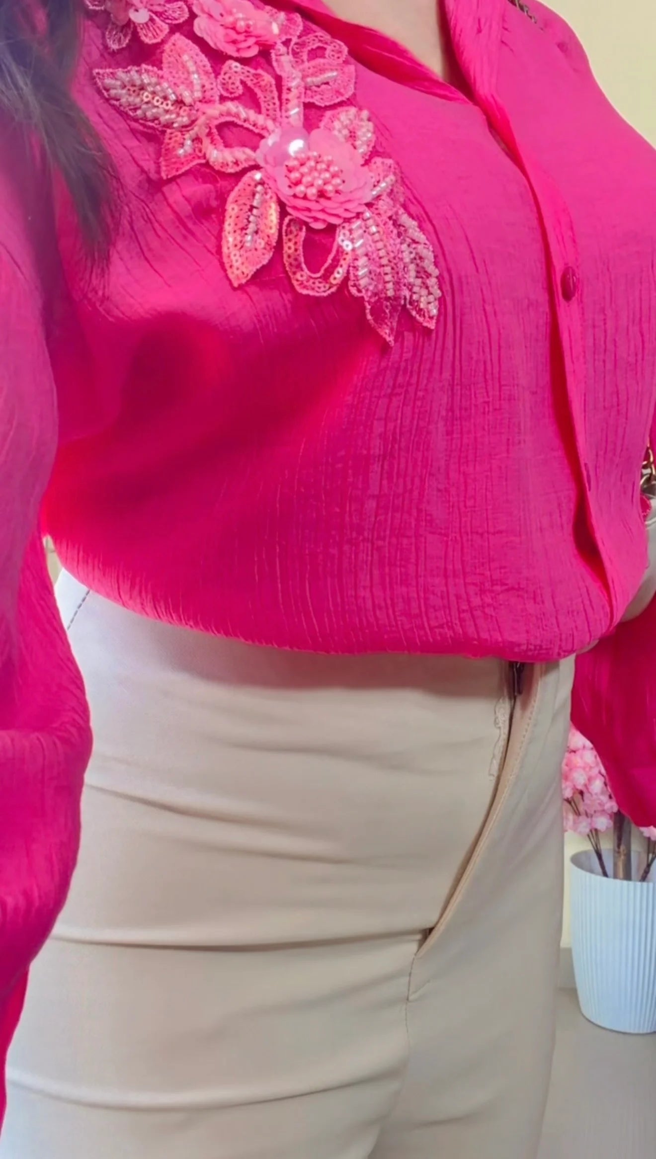 Crafted in soft crinkled cotton, this Pink Shirt features elegant white leaf embroidery, a classic collar, and a button-down front—perfect for chic everyday wear.